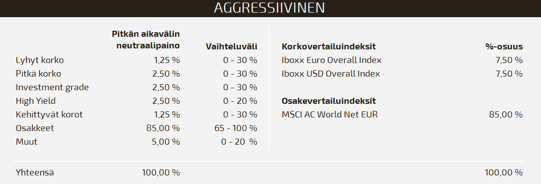 Aggressiivinen-strategia sopii sinulle, jos tavoitteesi on kasvattaa sijoittamaasi pääomaa tuottohakuisesti pitkällä aikavälillä. Aggressiivinen-salkkuun sijoittava tiedostaa, että sijoittamisen luonteen ja paremman tuoton tavoittelun myötä sijoitusten arvo voi vaihdella merkittävästi sijoitusaikana. Sijoituskohteena salkussa käytetään pääasiassa Obsido sijoitusrahastojen A4-osuussarjoja, joiden sijoituskohteina ovat muun muassa osakkeisiin ja eri korkoluokkiin, kuten yrityslainoihin ja joukkovelkakirjoihin, kohdistuvat ETF-rahastot. Neutraalitilanteessa salkun sijoituksia kohdistetaan 85 % osakesijoituksiin ja 15 % korko- sekä muihin omaisuusluokkiin.