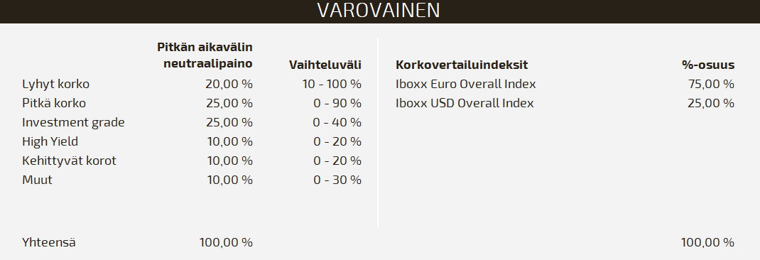 Varovainen-strategia sopii sinulle, jos ensisijainen tavoitteesi on turvata sijoittamasi pääoma pitkällä aikavälillä ilman sijoitusten arvon voimakasta vaihtelua. Sijoituskohteina salkussa käytetään pääasiassa eri korkoluokkiin, kuten yrityslainoihin ja joukkovelkakirjoihin, sijoittavia rahastoja sekä tilitalletuksia. Riskienhallinnallisista syistä – salkun arvonvaihtelun rajoittamiseksi – salkussa ei käytetä osakesijoituksia.